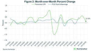 Numerator’s consumer inflation measure is constructed using both base-period and current-period quantity weights to combine item prices, an approach that is consistent with the structure of the U.S. Bureau of Economic Analysis’ PCE Price Index.